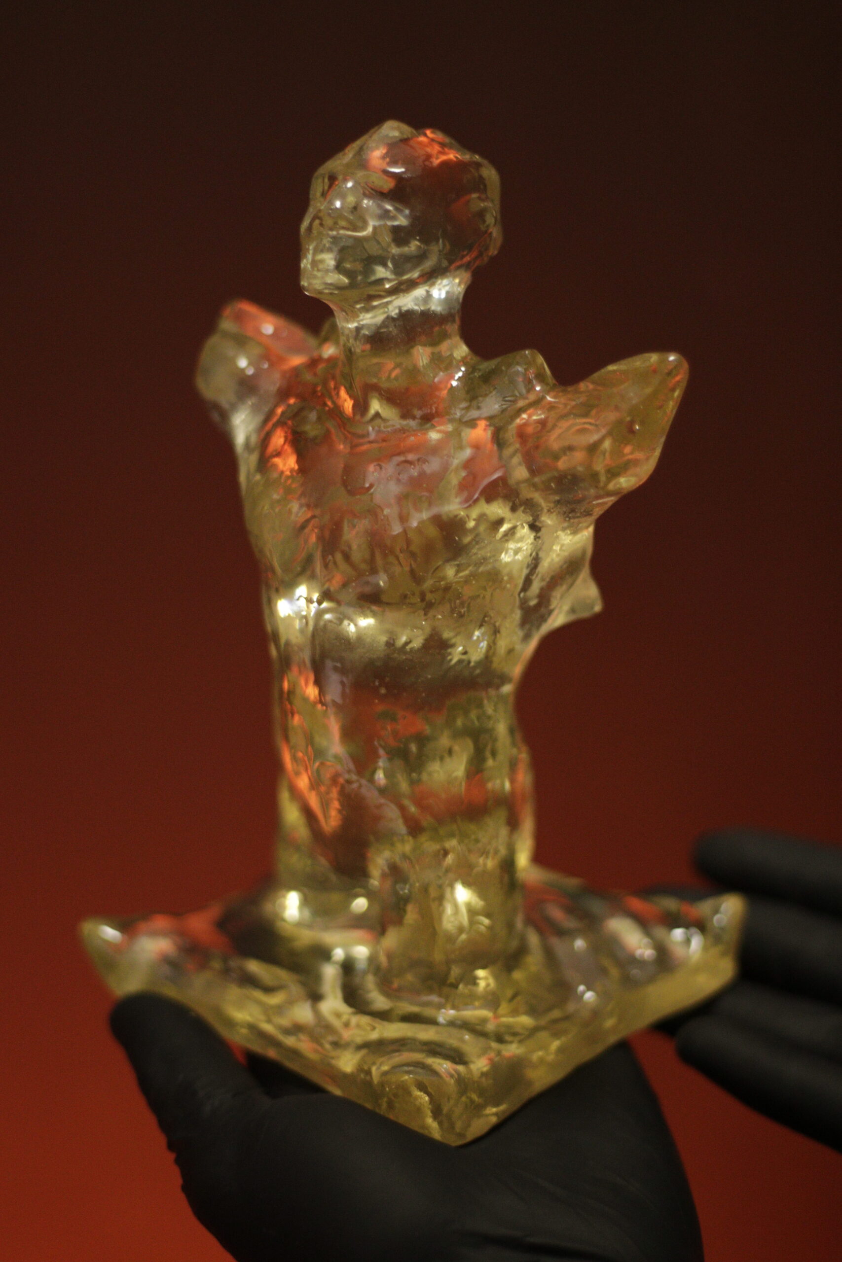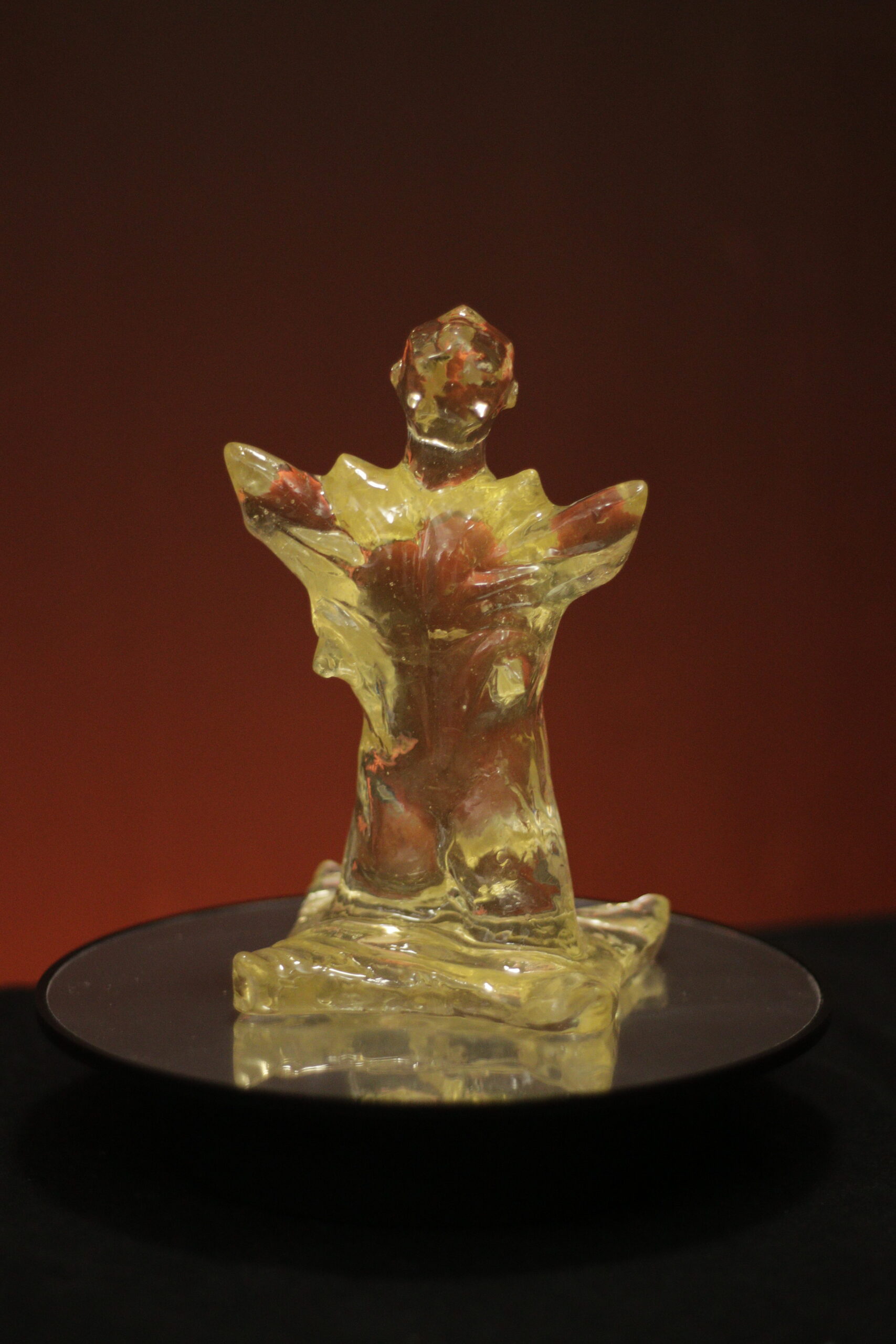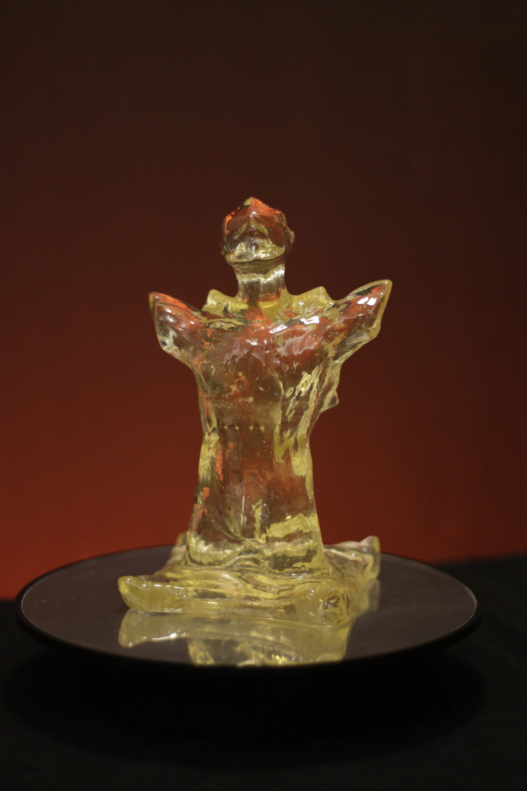 A peça é apresentada em sua cor crua e completamente translúcida. O leve tom queimado reage de forma sutil à luz, criando profundidade e presença no ambiente.