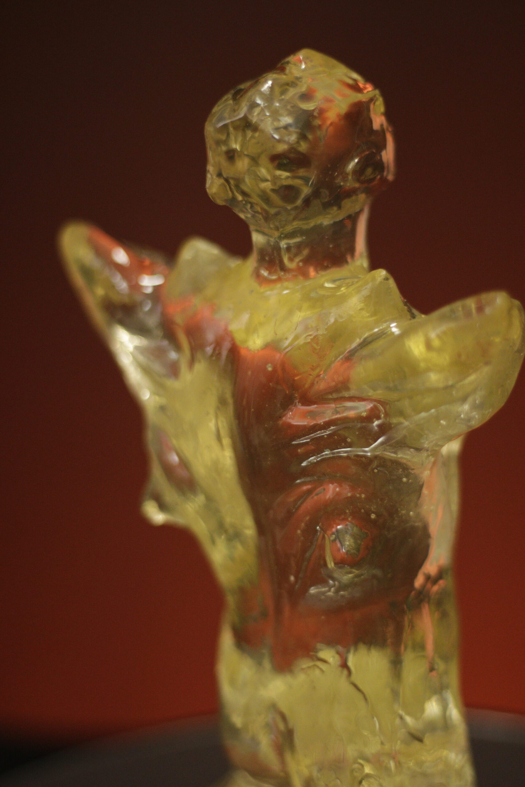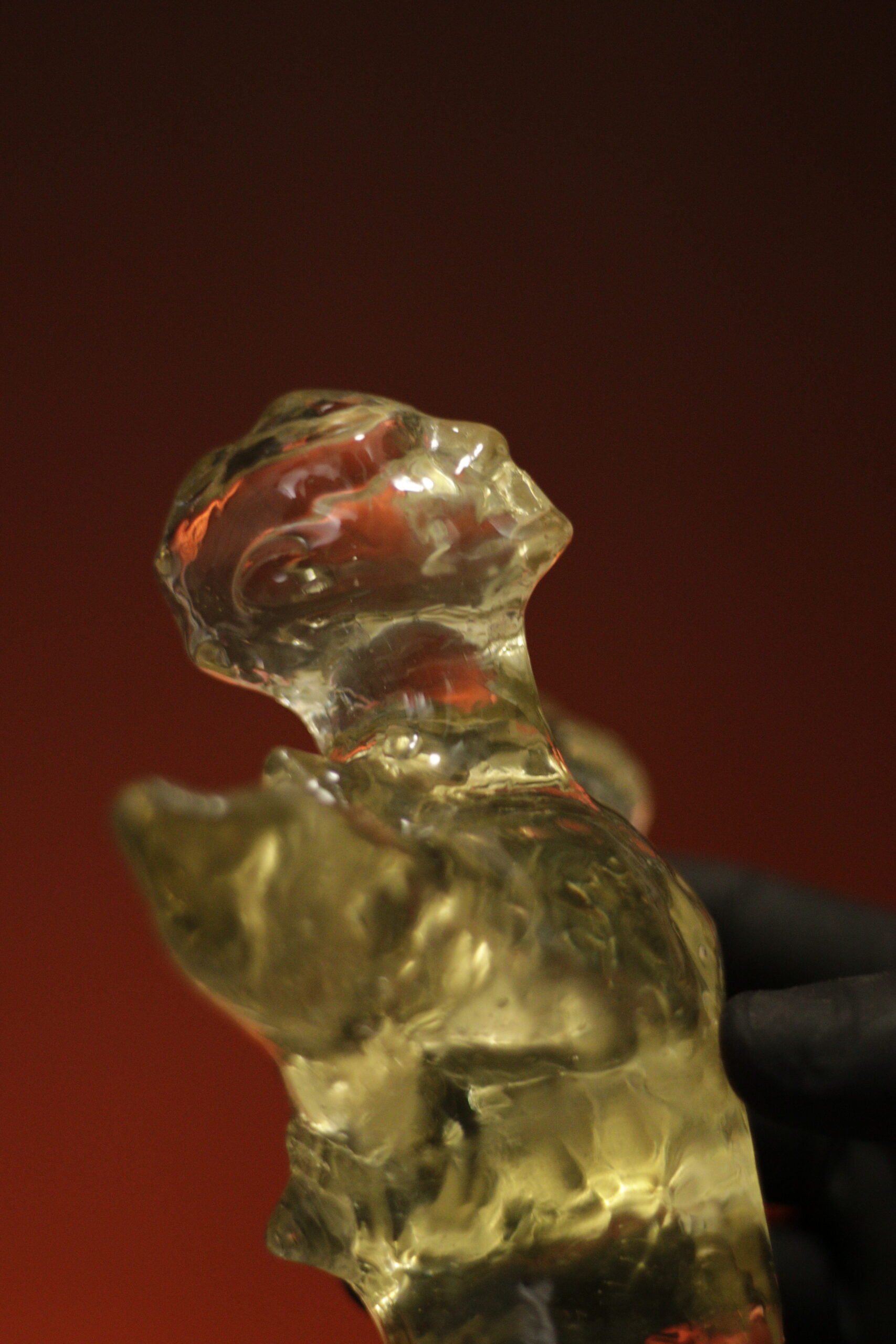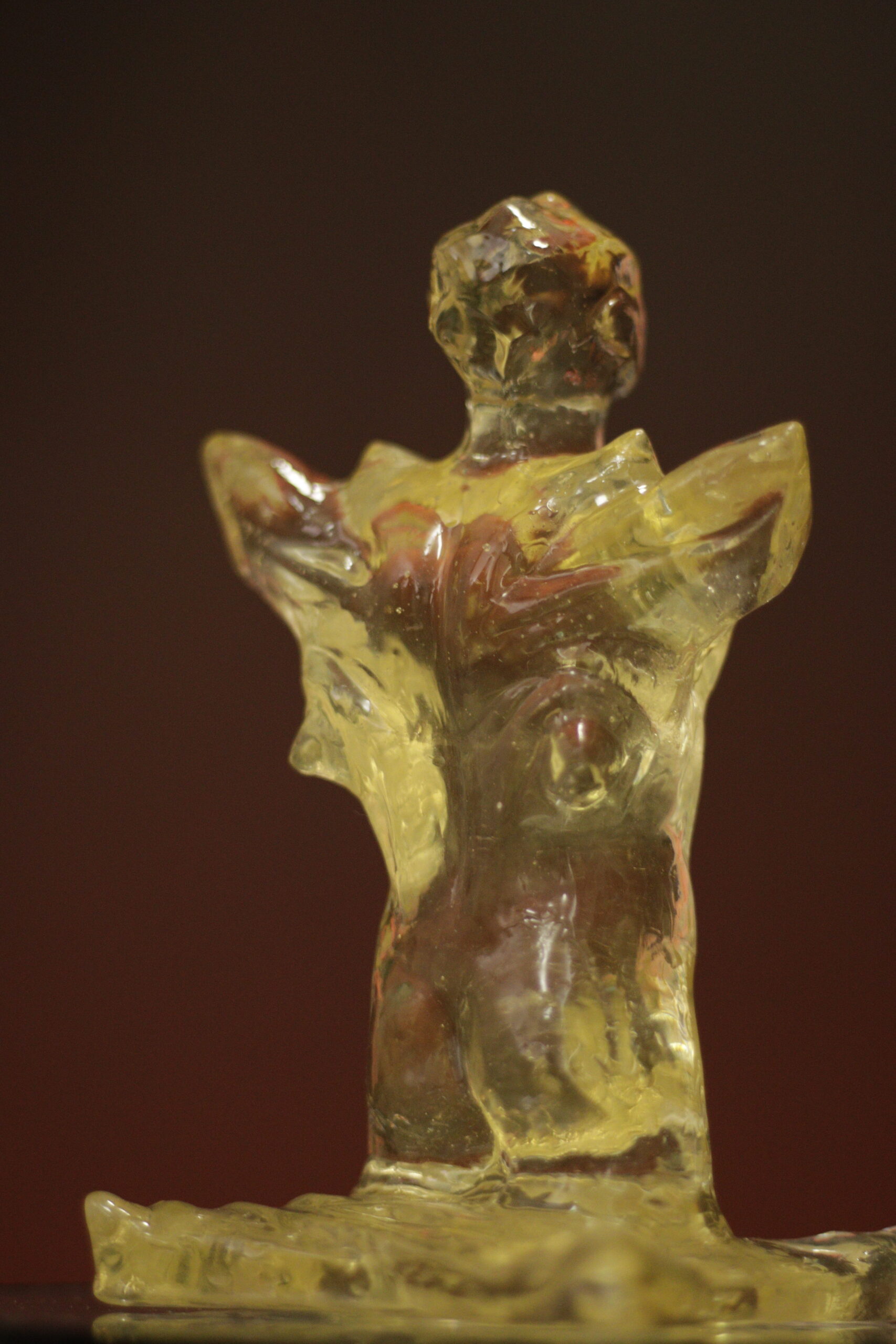 A peça é apresentada em sua cor crua e completamente translúcida. O leve tom queimado reage de forma sutil à luz, criando profundidade e presença no ambiente.